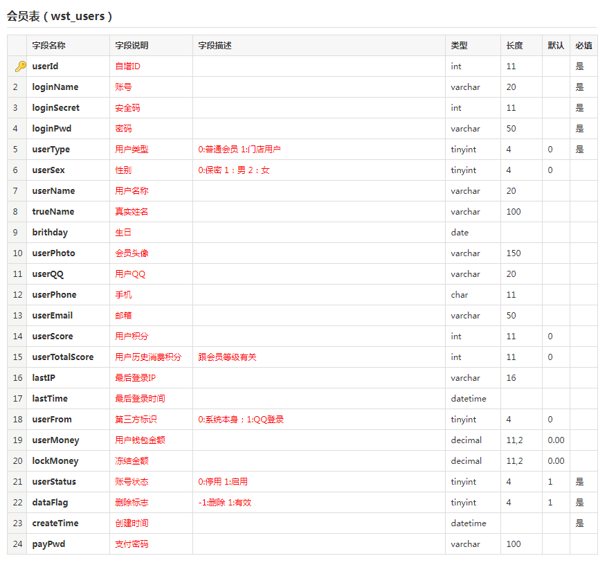 首先,我们设计商城系统的会员表,会涉及到账号、密码、姓名等资料,还会设计到头像、支付密码、钱包金额、冻结资金、创建时间等字段,详细见下表: